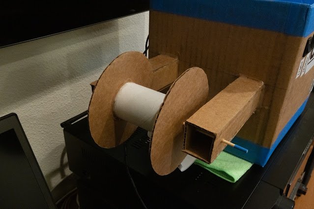 I decided to prototype this using simple cardboard, tape and hot-glue. The first component of the system are the spools. The media is loaded on the left side of the player and pulled through a cardboard box where the camera and a light source are mounted. The spool is simply constructed from a paper towel core cut down to size with cardboard end caps hot-glued on.