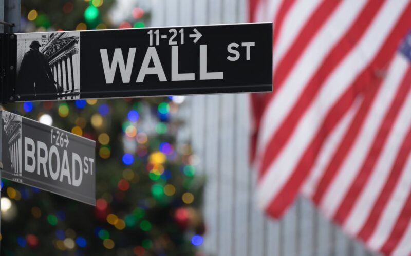 Wall Street sign in New York with American flag and Christmas tree lights in background.