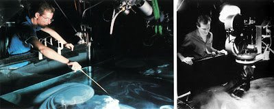 The cloud element for this iconic image was actually created by Gary Platek, by jumping on the hose that was used to drain the water tank! This sent a burst of water back through the system, and up through the drain in the bottom of the tank, which in turn parted the “clouds” as the shock-wave moved up through the water layers.