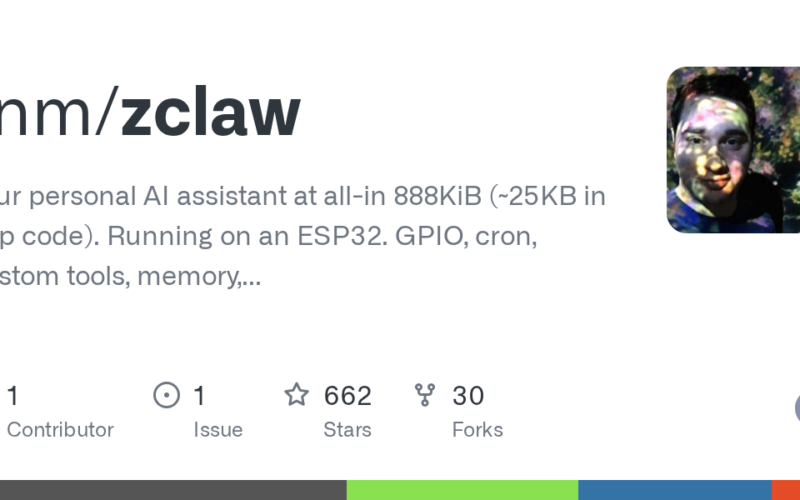 zclaw is written in C and runs on ESP32 boards with a strict all-in firmware budget target of <= 888 KiB on the default build. It supports scheduled tasks, GPIO control, persistent memory, and custom tool composition through natural language.