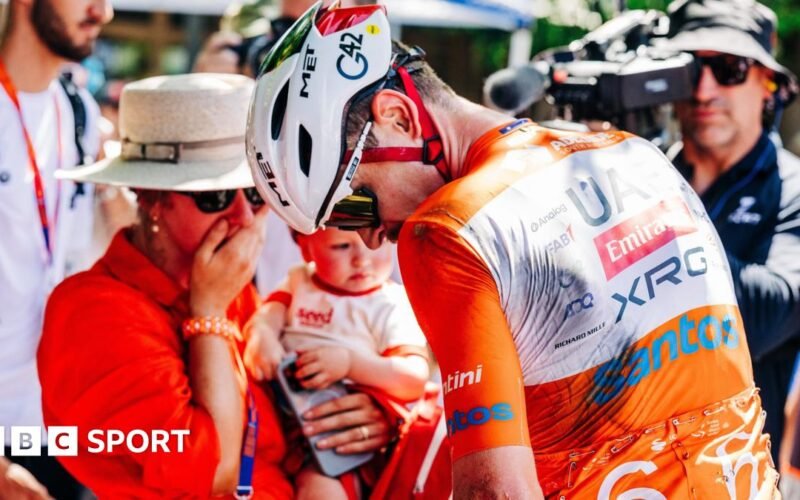 After Fine fell, he used his teammate’s bike to claim the winner’s yellow jersey by one minute and three seconds for UAE-XRG.
