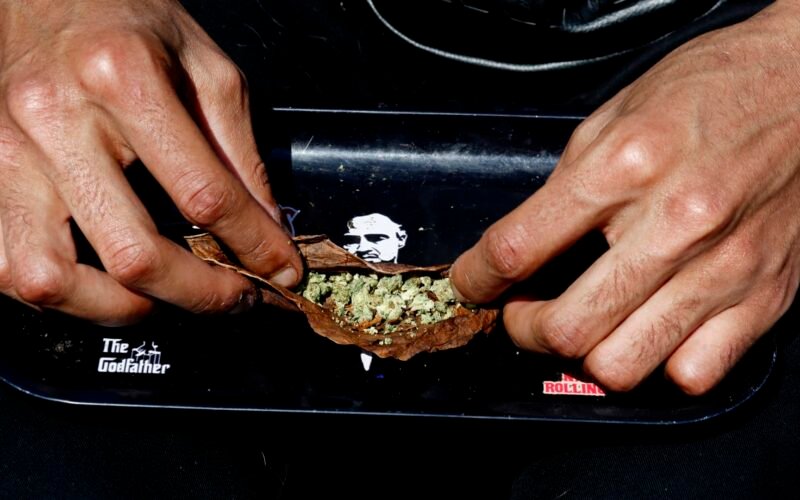 A man prepares a marijuana cigarette in Washington Square Park on April 20, 2023 in New York City.