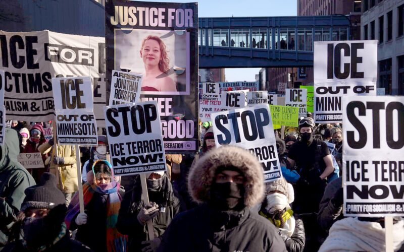 In subzero temperatures, protesters marched through downtown Minneapolis on January 23, 2026, waving signs condemning ongoing immigration enforcement operations in the Twin Cities metro area.