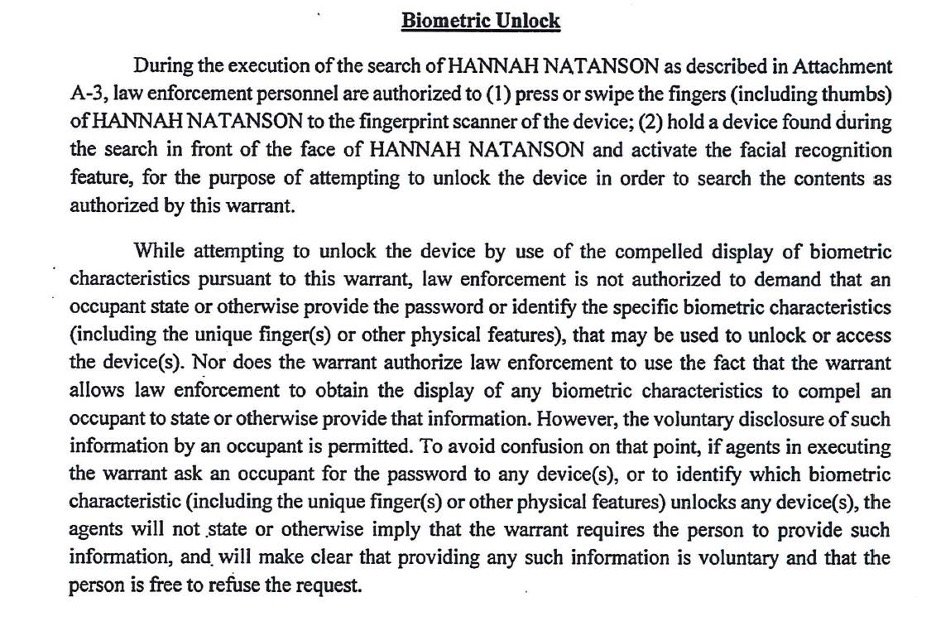 Included in the search and seizure warrant for the raid on Natanson’s home is a section titled “Biometric Unlock,” which explicitly authorized law enforcement personnel to obtain Natanson’s phone and both hold the device in front of her face and to forcibly use her fingers to unlock it. In other words, a judge gave the FBI permission to attempt to bypass biometrics: the convenient shortcuts that let you unlock your phone by scanning your fingerprint or face.