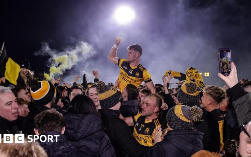 The fourth official’s board showed three minutes of extra time, but it was the men in black and amber who had possession, with Gareth Donaghy volleying the ball over the bar to put his club ahead.