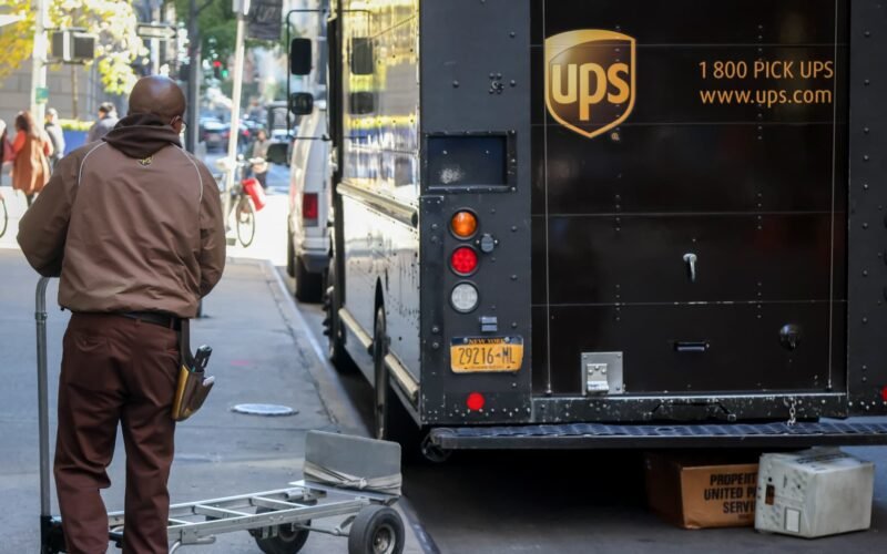 A UPS worker pushes a cart in New York, United States, on Monday, October 27, 2025.