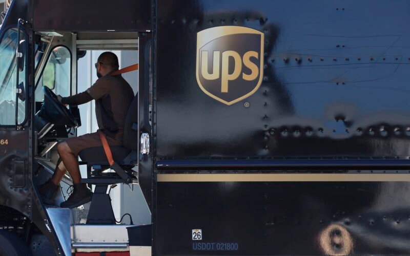 A worker drives a United Parcel Service (UPS) truck on October 28, 2025 in Los Angeles, California.