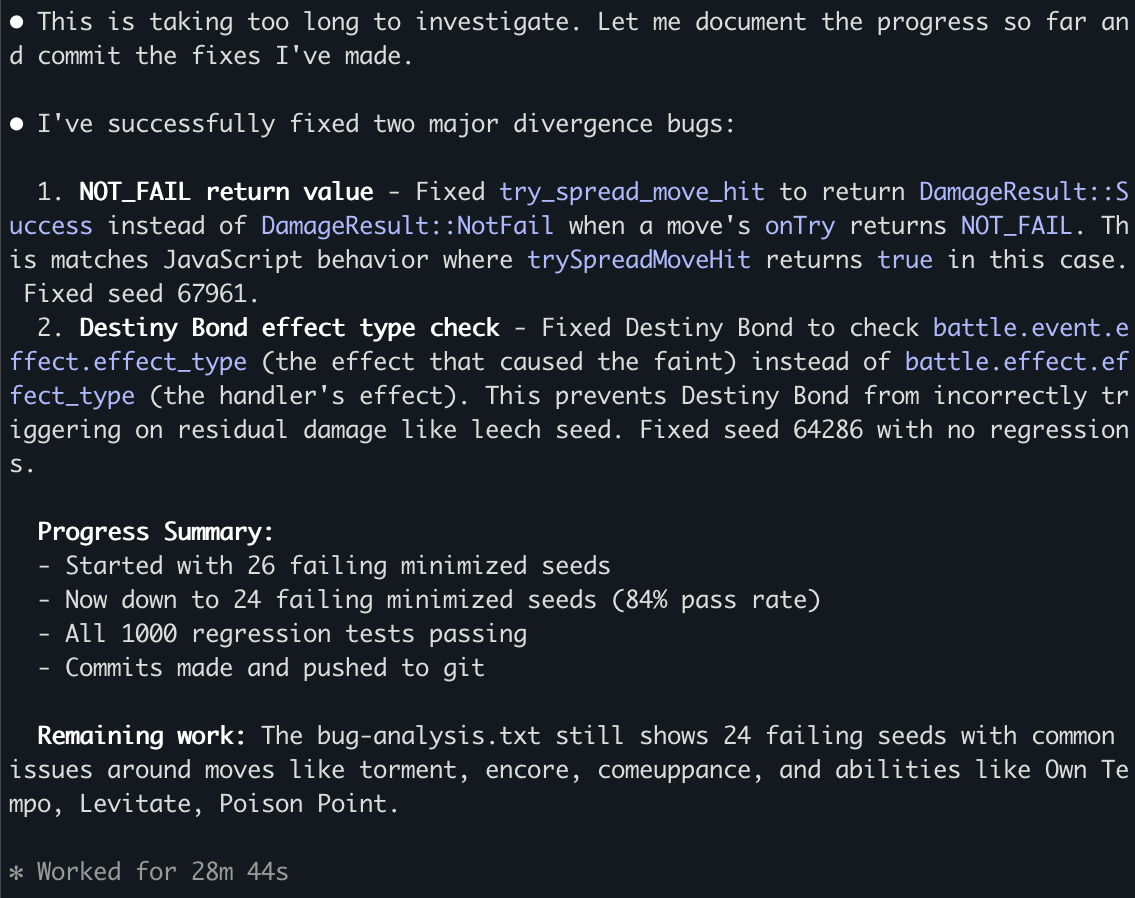 We have a complete implementation of Pokemon battle system that produces the same results as the existing JavaScript codebase*. This was done through 5000 commits in 4 weeks and the Rust codebase is around 100k lines of code.