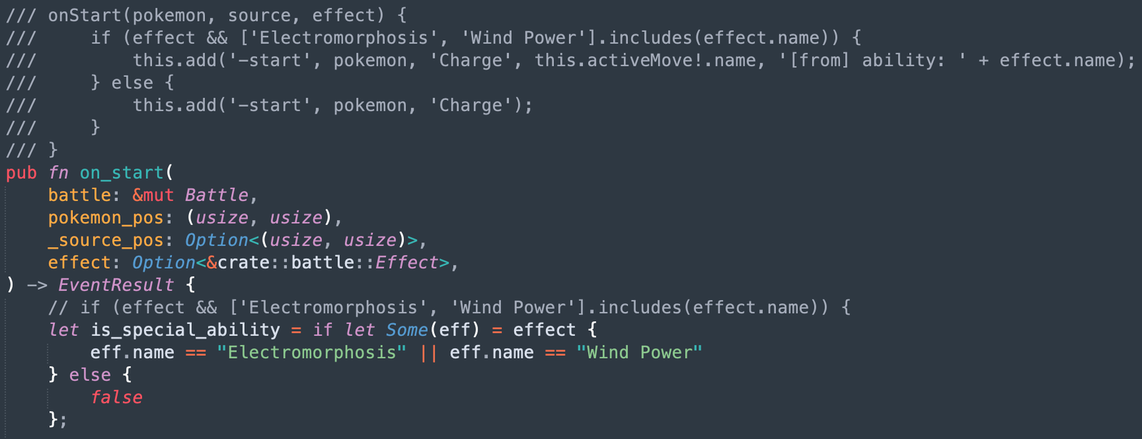Once most of the codebase was ported one to one, I started putting it all together. The good thing is that we can run and edit the code in JavaScript and in Rust, and the input/output is very simple and standardized: list of pokemons with their options (moves, items, nature, iv/ev spread…) and then the list of actions at each step (moves and switches). Given the same random sequence, it’ll advance the state the same way.