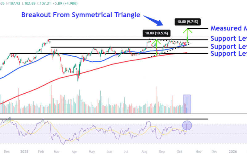 The first lower level to watch is around $105. This area is likely to provide significant support near the prominent peaks that formed on the chart in February, August, and September.
