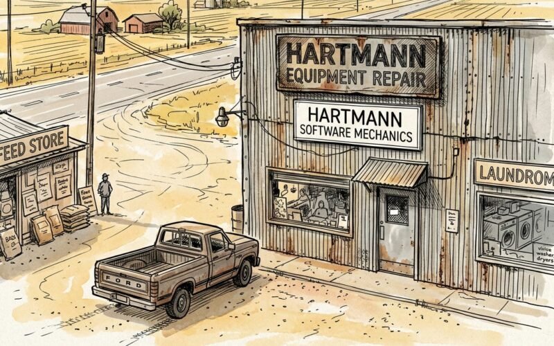 He pulled into the shop lot and parked. The sign on the building — HARTMANN SOFTWARE MECHANICS, below HARTMANN EQUIPMENT REPAIR — was lit by the security light above the door. Both signs were accurate. He fixed things. Some of the things had engines. Some of the things had specifications. All of them belonged to people who were trying to grow food in a complicated world, and all of them, sooner or later, needed someone who could see where the ground had moved.