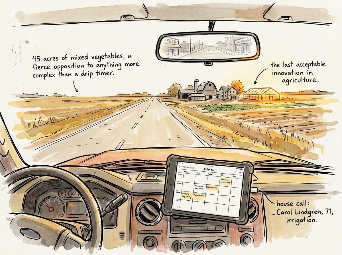 The house call was for Carol Lindgren, who was seventy-one and ran a small organic operation (45 acres of mixed vegetables, a farm stand on County Road K, and a fierce opposition to any technology more complex than a drip irrigation timer, which she considered the last acceptable innovation in agriculture). She had called this morning and said, with the particular tone of someone delivering information they found personally distressing, that her grandson had “put some software on the irrigation.”