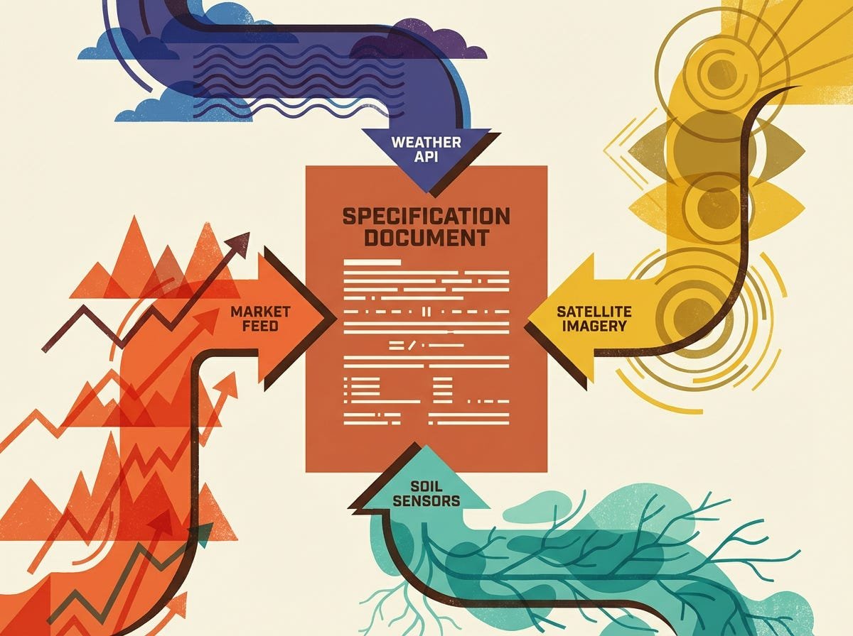 Margaret’s spec was better than average, which was not saying much. It was about 1,200 words long. It described the data sources (soil sensors, weather API, market feed, satellite), the decision logic (”recommend harvest when expected quality-adjusted revenue is maximized across a 14-day forward window”), and the output format (green/yellow/red with a confidence percentage).
