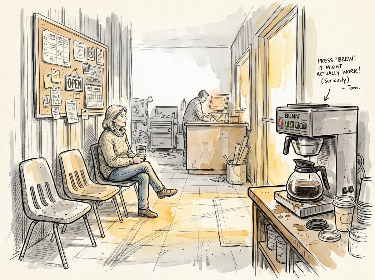 His shop was in a corrugated steel building on Highway 29, between a feed store and a Laundromat. It had a waiting area with four plastic chairs and a coffee machine that Tom had specified himself and which made coffee that was, by consensus of his clients, exactly adequate and no better. He’d tried to improve the spec three times. Each time, the regenerated firmware made the coffee subtly worse in a different way. He’d eventually concluded that coffee machine specs existed at the exact intersection of fluid dynamics, thermal management, and taste (three domains where natural language was particularly poor at capturing the relevant distinctions) and had stopped trying. He had, however, found a use for it: when new clients came in insisting that the software they’d generated was “basically fine” and “just needs a little tweak,” he would gesture at the coffee machine and say, “I’ve been trying to get that thing to make decent coffee for two years. You think your sixty-parameter irrigation optimizer is going to be simpler?” This was usually effective. People understood coffee.