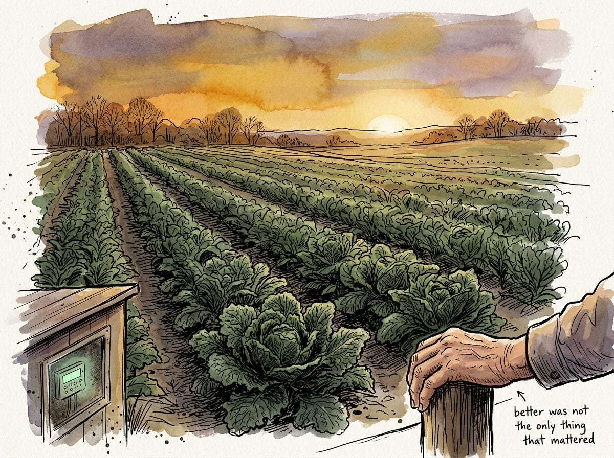 He installed the switch. He set up the logging. He showed Carol how to read the override log on her tablet, ”you can also just ignore it, and I’ll check it when I come for inspections”. He gave Tyler’s system a clean bill of health with a note about the four spots where Carol’s knowledge and the system’s logic conflicted. And he left Carol standing in her irrigation shed, one hand on the new switch and the other holding a cup of tea, looking out at her rows of kale with the expression of a woman who had been told that the machines were better and had decided, calmly and without drama, that better was not the only thing that mattered.