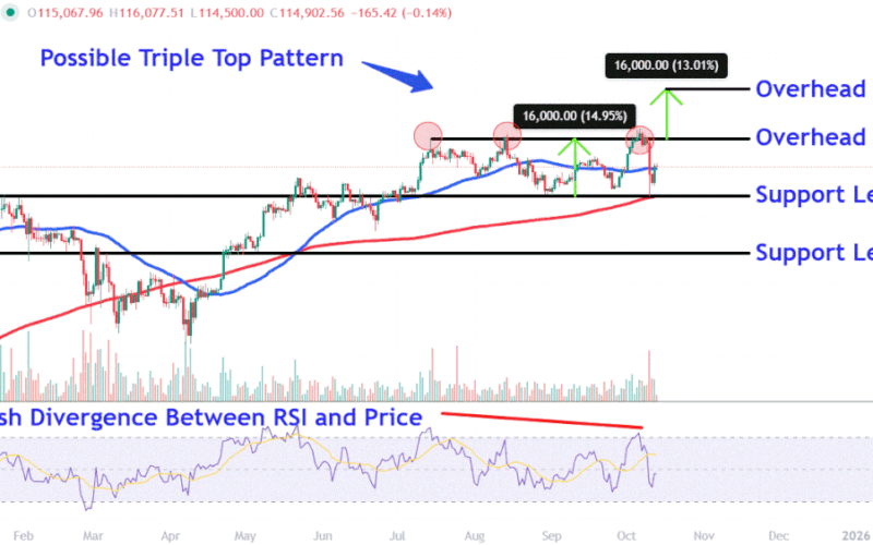 After hitting a new record high just above its three-month trading range early last week, the price of Bitcoin has fallen sharply, raising the possibility of a rare triple top pattern emerging in the process.
