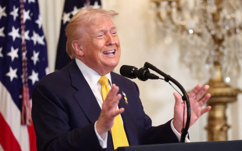 President Donald Trump stands next to Alice Marie Johnson, a criminal justice reform advocate who served 21 years for a nonviolent drug offense before it was commuted in 2018 and pardoned in 2020 by Trump, as they attend a Black History Month reception at the White House on February 18, 2026. Photo by Kevin LaMarque/Reuters