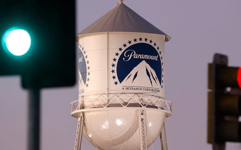 The Paramount logo is displayed on the water tower at Paramount Studios on December 8, 2025 in Los Angeles, California.