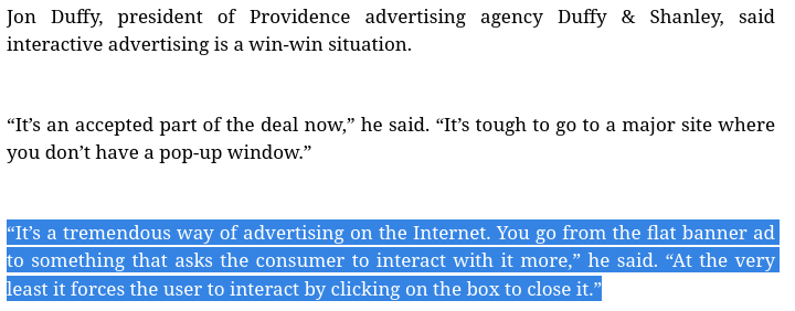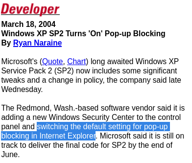 In a short time, the situation got so bad that web browsers started deploying built-in pop-up blocking technology to improve web browsing for their users. This was a major feature. News articles were written about it. It was a major selling point for Firefox’s first 1.0 release in 2004. Later that year, Microsoft made the news by enabling pop-up blocking by default in their popular Internet Explorer web browser.