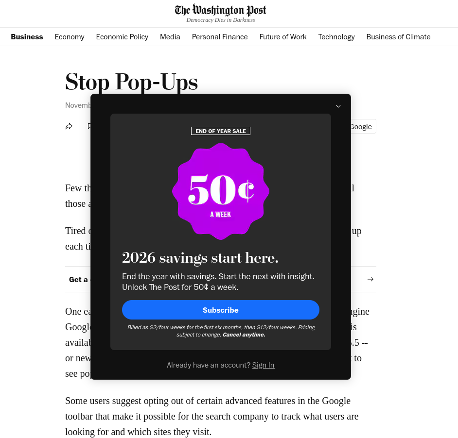 It’s time for web browser developers to give pop-up blocking another swing. Yeah it’s hard, but I guarantee it’ll make the news again if a browser pulls this off and enables it by default. Imagine the accolades a browser would get for getting rid of all these pointless distractions. It would even invigorate a new discussion about other things web browsers may do to alter websites for an improved user experience. Yes, there will be whiny news articles and opinion pieces from web developers, but these same sociopaths existed in the 2000s, too. We ignored them then, and we can ignore them now.