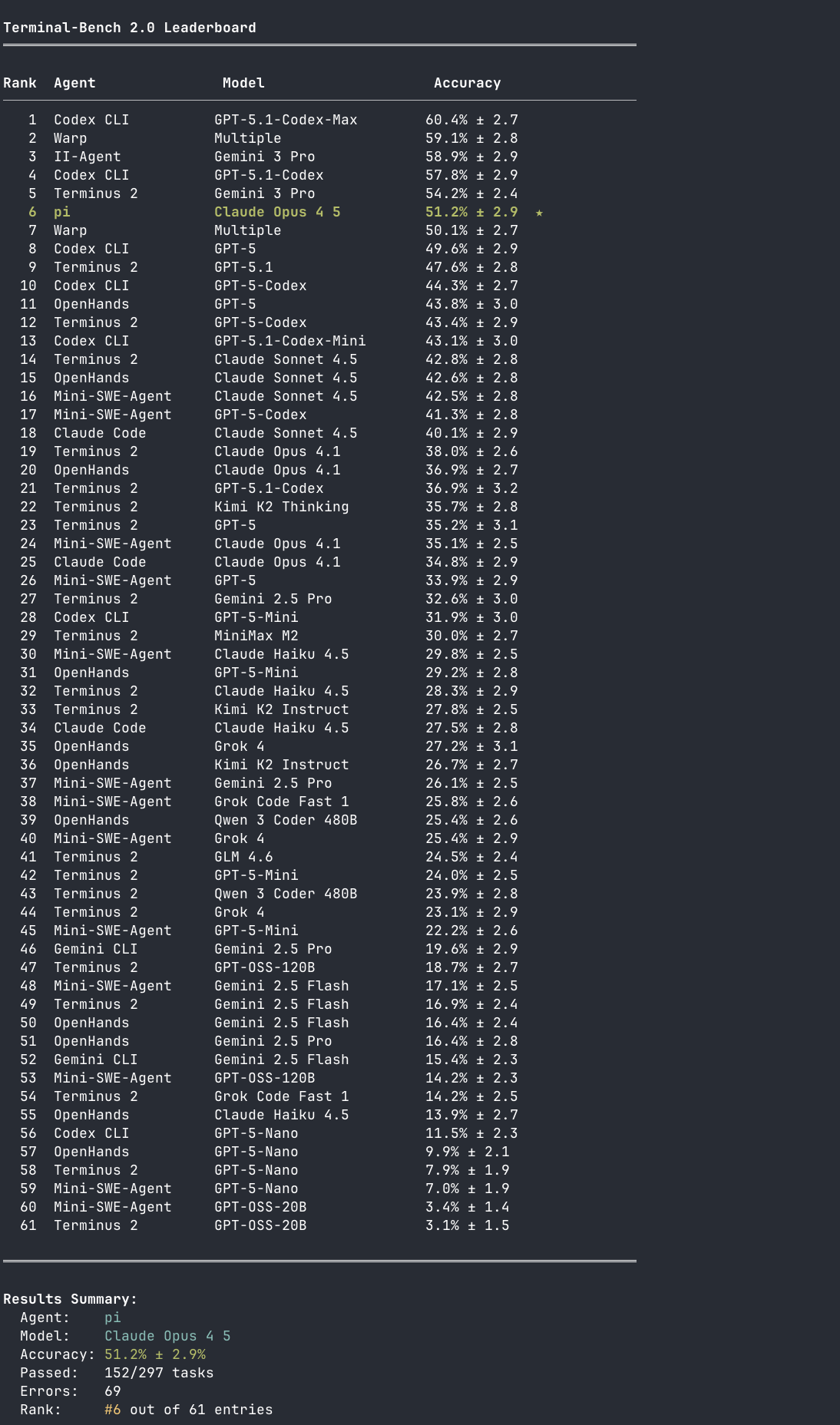 I make a lot of grandiose claims, but do I have numerical proof that all the contrarian things I say above actually work? I have my lived experience, but that’s hard to transport in a blog post and you’d just have to believe me. So I created a Terminal-Bench 2.0 test run for pi with Claude Opus 4.5 and let it compete against Codex, Cursor, Windsurf, and other coding harnesses with their respective native models. Obviously, we all know benchmarks aren’t representative of real-world performance, but it’s the best I can provide you as a sort of proof that not everything I say is complete bullshit.