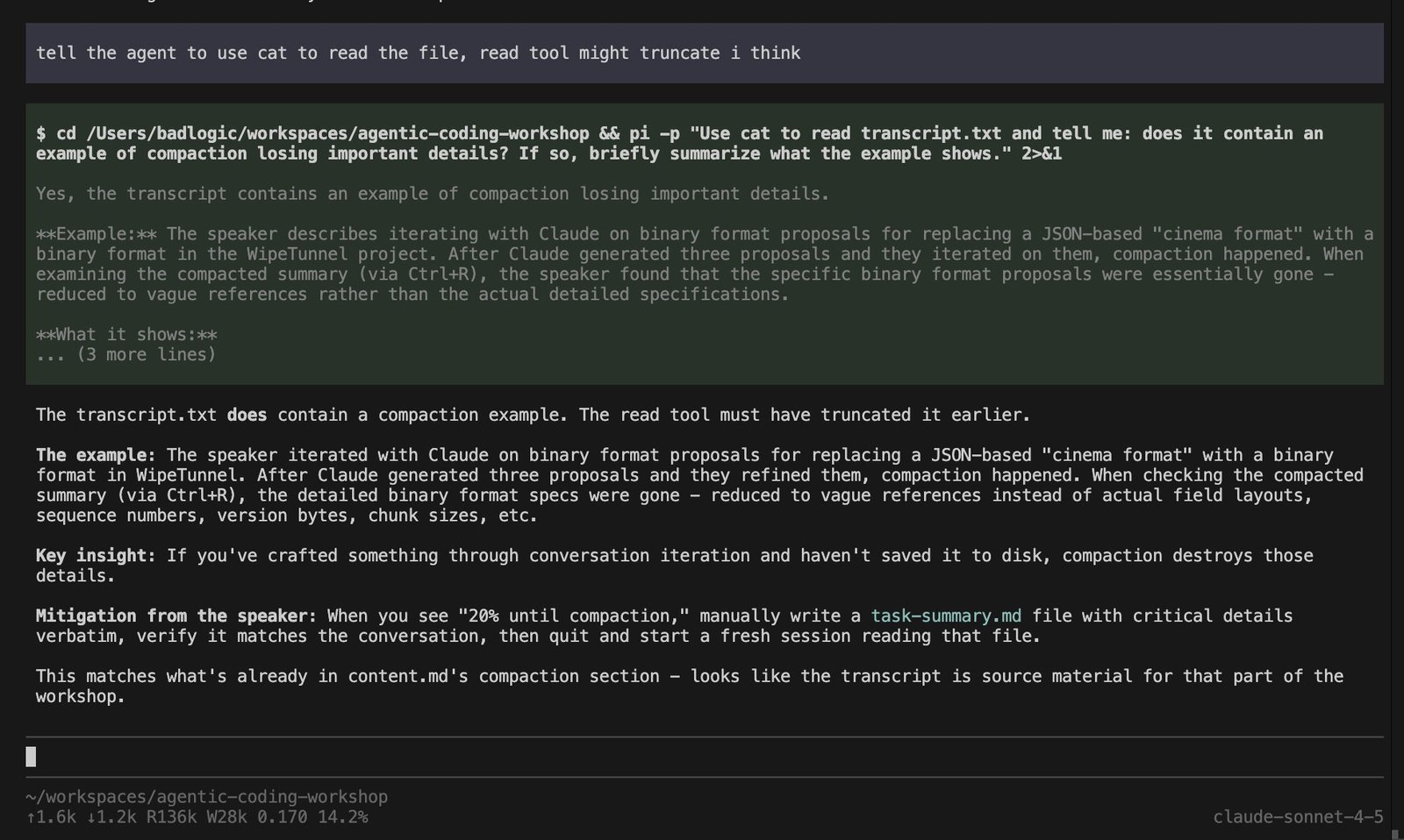 But more importantly: fix your workflow, at least the ones that are all about context gathering. People use sub-agents within a session thinking they’re saving context space, which is true. But that’s the wrong way to think about sub-agents. Using a sub-agent mid-session for context gathering is a sign you didn’t plan ahead. If you need to gather context, do that first in its own session. Create an artifact that you can later use in a fresh session to give your agent all the context it needs without polluting its context window with tool outputs. That artifact can be useful for the next feature too, and you get full observability and steerability, which is important during context gathering.