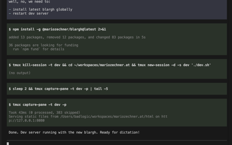 How’s that for observability? The same approach works for long-running dev servers, watching log output, and similar use cases. And if you wanted to, you could hop into that LLDB session above via tmux and co-debug with the agent. Tmux also gives you a CLI argument to list all active sessions. How nice.