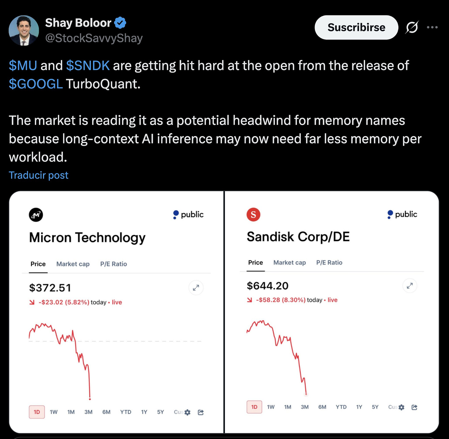 Anthropic is not the only one that is able to crash the market cap of public companies with a single announcement. Immediately after Google’s announcement, the stock from memory manufacturing companies like Micron and Sandisk plunged (and as an investor in Micron, this hits me home 🙈).