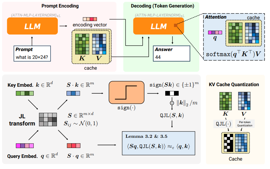 Stage 2: QJL (Quantised Johnson-Lindenstrauss). PolarQuant handles the main compression, but any quantisation introduces error, and some of that error accumulates in the dot products that the transformer uses to compute attention scores. QJL’s job is to correct for this bias. It applies a Johnson-Lindenstrauss transform to the residual error, a random projection that preserves distances between high-dimensional points, and then reduces each component to a single sign bit: +1 or -1. The result is an unbiased estimator for the inner products, with zero additional memory overhead. The error correction costs nothing to store (see bottom-left part of the image below for a mental model of the shift from existing quantised KV cache and a QJL-transformed one).