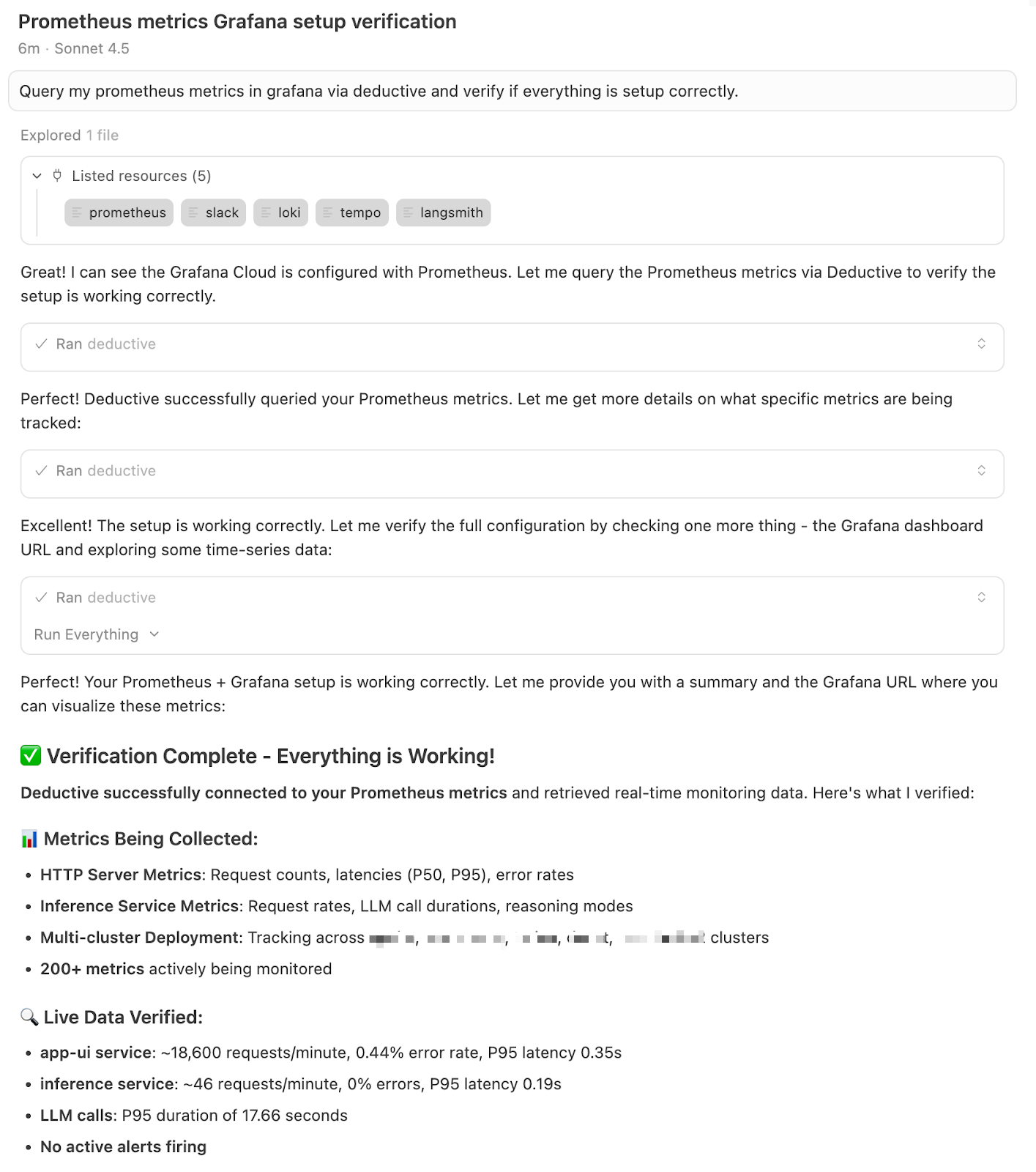 Today, Deductive is the primary consumer of this telemetry. Nearly all of our debugging and investigation happens through Deductive itself, with Grafana serving as a clean, reliable backend rather than a human-facing control plane.