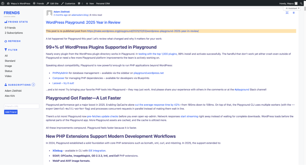 Using the Friends plugin, WordPress becomes a quiet, personal feed reader. Instead of relying on external platforms, you can follow sites and creators inside your own WordPress and read at your own pace, free from algorithms or engagement pressure.