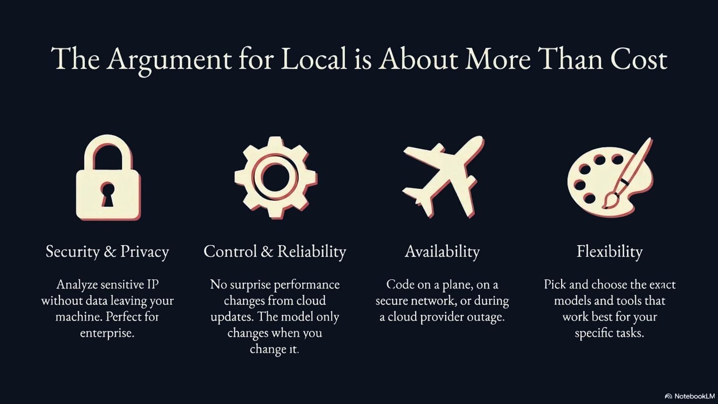 You might wonder why local models are worth investing in at all. The obvious answer is cost. By using your own hardware, you don’t need to pay a subscription fee to a cloud provider for your tool. There are also a few less obvious and underrated reasons that make local models useful.