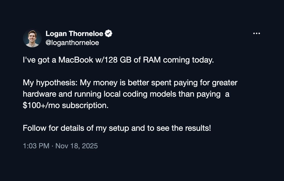 So, to create by far the most expensive article I’ve ever written, I put my money where my mouth is and bought a MacBook Pro with 128 GB of RAM to get to work. My idea was simple: Over the life of the MacBook I’d recoup the costs of it by not paying for an AI coding subscription.