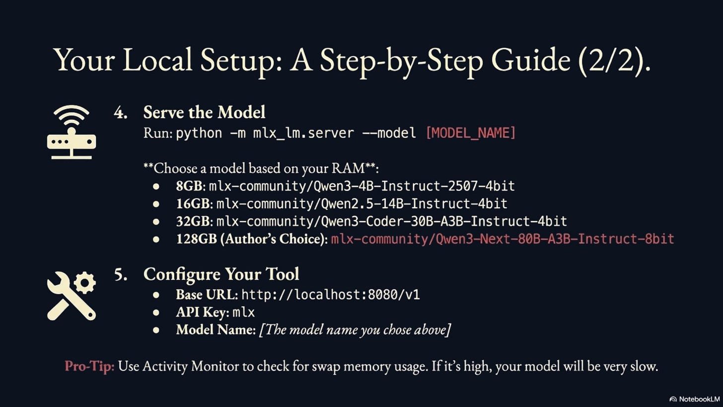 Serve the model as an OpenAI compatible API using python -m mlx_lm.server –model mlx-community/Qwen3-Next-80B-A3B-Instruct-8bit. This command both runs the server and downloads the model for you if you haven’t yet. This particular model is what I’m using with 128GB of RAM. If you have less RAM, check out smaller models such as mlx-community/Qwen3-4B-Instruct-2507-4bit (8 GB RAM), mlx-community/Qwen2.5-14B-Instruct-4bit (16 GB RAM), mlx-community/Qwen3-Coder-30B-A3B-Instruct-4bit (32 GB RAM), or mlx-community/Qwen3-Next-80B-A3B-Instruct-4bit (64-96 GB RAM).