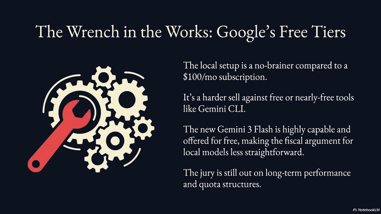 Initially, I considered my local coding setup to be a great pair to Google’s free tier. It definitely performs better than Gemini 2.5 Flash and makes a great companion to Gemini 3 Pro. Gemini 3 Pro can solve more complex tasks with the local model doing everything else. This not only saves quota on 3 Pro but also provides a very capable fallback for when quota is hit.