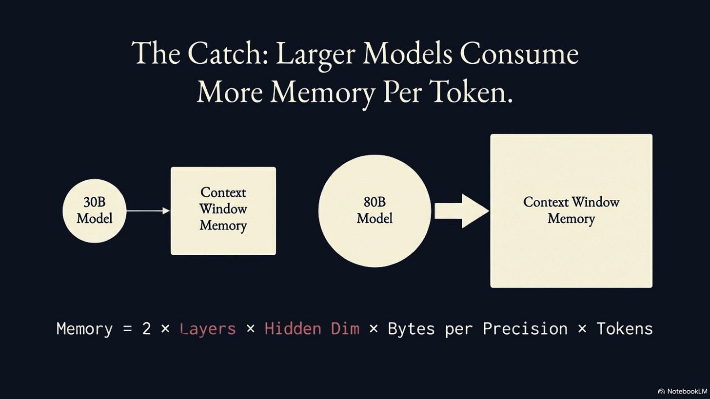 This means choosing an 80B parameter model over a 30B parameter model requires more memory for the model itself and also more memory for the same size context window. For example, a 30B parameter model might have a hidden dimension of 5120 with 64 layers while an 80B model has a hidden dimension of 8192 with 80 layers. Doing some back-of-the-napkin math shows us that the larger model requires approximately 2x more RAM to maintain the same context window as the 30B parameter model (see formula below).