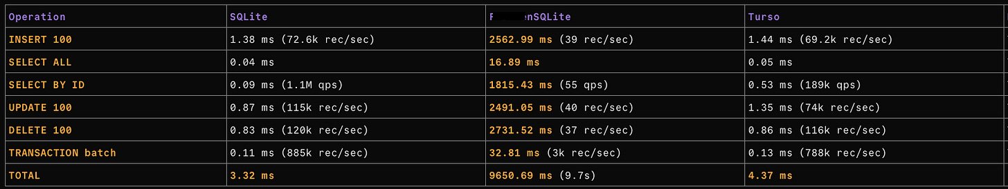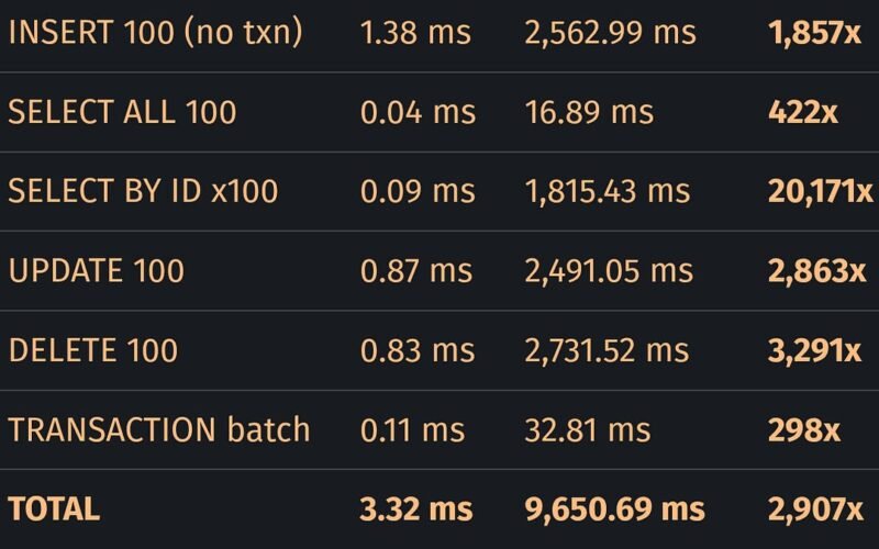 I’ll take the TRANSACTION batch row as the baseline because it doesn’t have the same glaring bugs as the others, namely no WHERE clauses and per-statement syncs. In this run that baseline is already 298x, which means even the best-case path is far behind SQLite. Anything above 298x signals a bug.