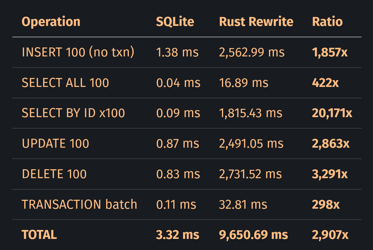 Every decision sounds like choosing safety. But the end result is about 2,900x slower in this benchmark. A database’s hot path is the one place where you probably shouldn’t choose safety over performance. SQLite is not primarily fast because it is written in C. Well.. that too, but it is fast because 26 years of profiling have identified which tradeoffs matter.